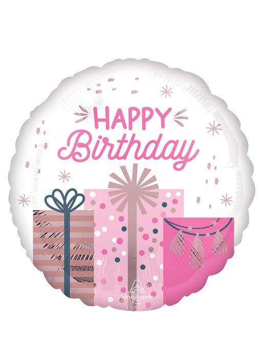 Pink birthday presents design 17 inch round Happy Birthday foil balloon. Click & Collect orders: Balloon supplied inflated with helium. Deli...