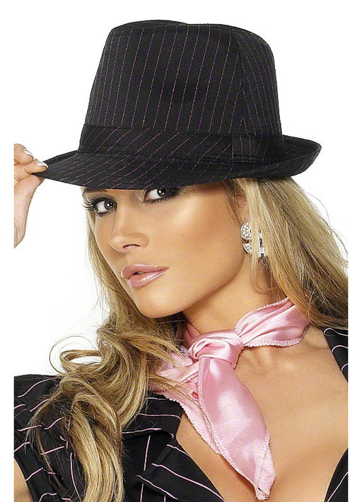 Complete the female gangster look with this quality black gangster hat with pink pin stripe.