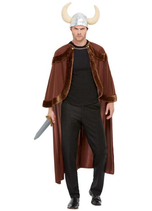 One standard size Viking long brown cape with trim and neck chain and material silver helmet with horns.