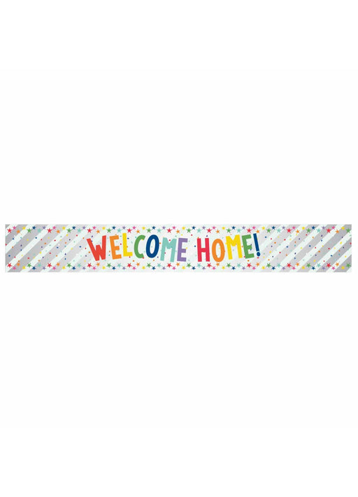 Welcome Home foil banner repeated three times with multi-coloured star design measuring 2.7m in length.