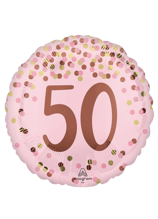Blush pretty pink age 50 birthday 17" round foil balloon decorated with spots. Click & Collect orders: Balloon supplied inflated with helium....