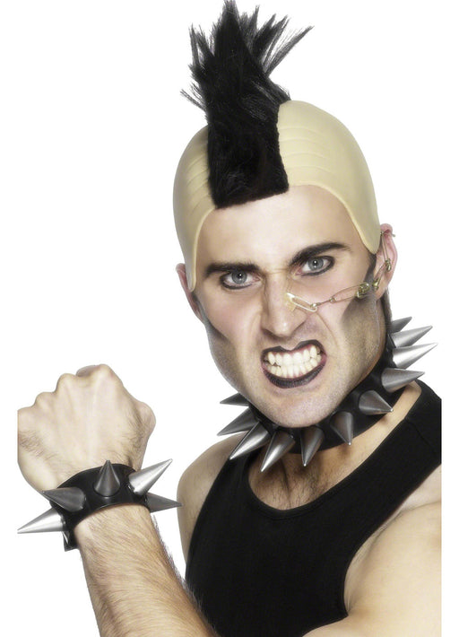 Deluxe Halloween punk skull overhead latex mask with studded choker effect and spiky green hair.