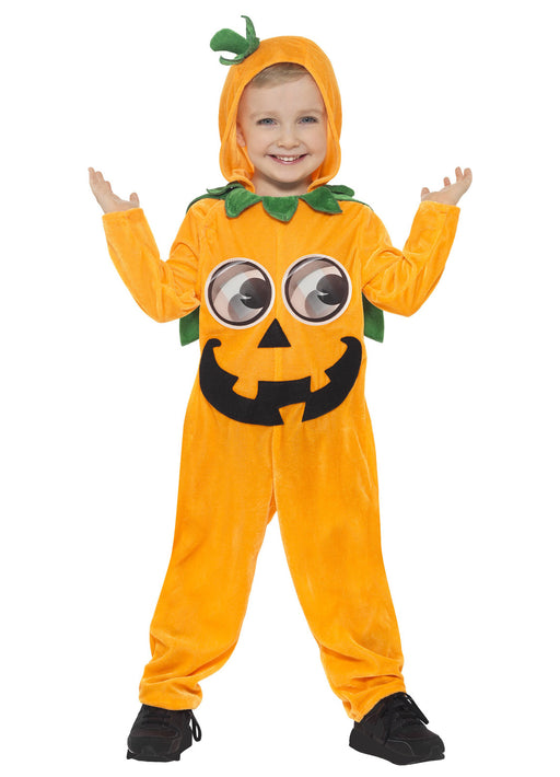 Pumpkin toddler fancy dress costume consisting of orange hooded jumpsuit with green trim and 3D printed eyes. Size Age Chest Waist Height Sm...