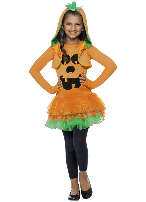 Pumpkin tutu dress child consisting of orange dress decorated with pumpkin facial design and tutu skirt section. Also included is the matching hood...