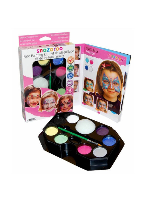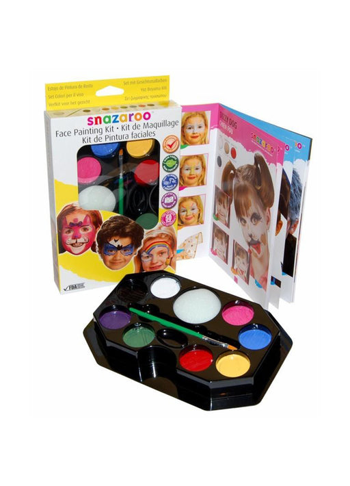 Snazaroo face painting kit consisting of 8 colour pallet, 1 make up sponge, 1 make up brush and a step by step paint guide.