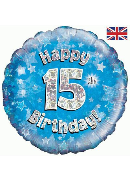 Blue age 15 holographic standard round foil balloon measuring 18" (45.7 cm) when inflated. Made in UK. Click & Collect orders: Balloon suppli...