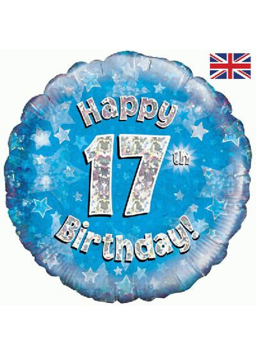Blue age 17 holographic standard round foil balloon measuring 18" (45.7 cm) when inflated. Made in UK. Click & Collect orders: Balloon suppli...