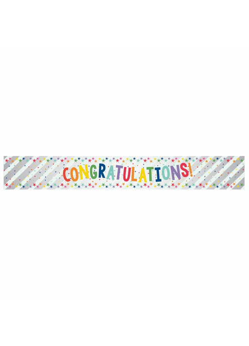 Congratulations foil banner repeated three times with multi-coloured star design measuring 2.7m in length.