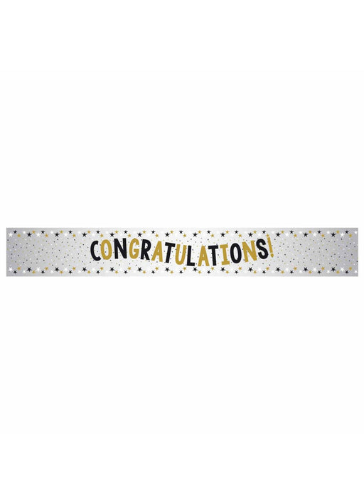Black , gold and silver Congratulations foil banner repeated three times with star design measuring 2.7m in length.