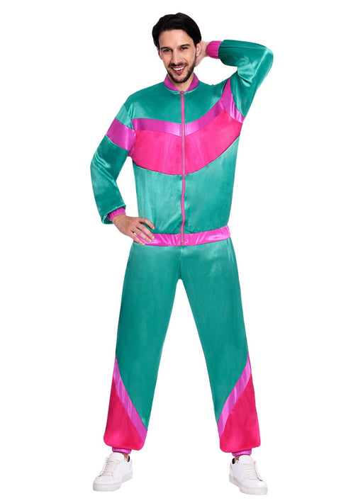 Men's 1980's shell suit fancy dress costume with green, purple and pink top with front zip along with matching elasticated trousers. Costume Sizes:...