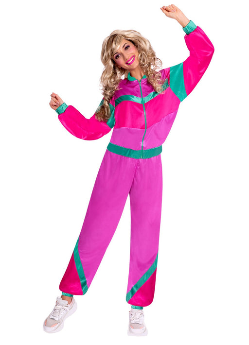 Women's 1980's shell suit fancy dress costume with pink, green and purple top with front zip along with matching elasticated trousers.