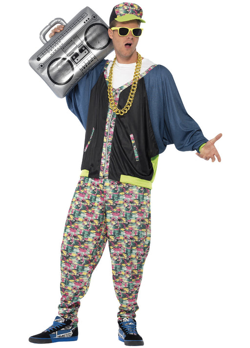 80's themed Hip Hop fancy dress costume consisting of baggy jersey fabric jacket decorated with numerous coloured panels, elasticated trousers with...