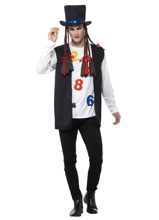 Boy George style 1980's pop star costume with white multi-coloured printed top, black waistcoat and hat with attached braids. Size Chest Waist ...