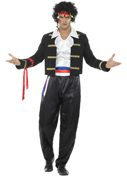 1980's themed New Romantic fancy dress costume consisting of black elasticated trousers with colourful waist band, matching jacket with gold trim a...