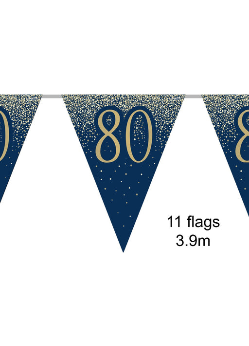 3.9 metre (over 12 ft) long 80th birthday metallic glitter navy gold party bunting consisting of 11 flags.