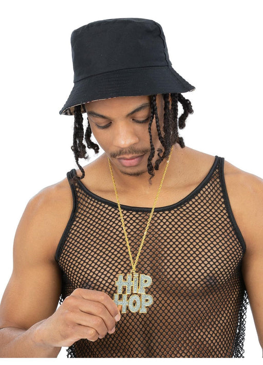 Turn into a rap star in an instant with this 1990's fancy dress kit containing black bucket hat, specs and gold dollar medallion.