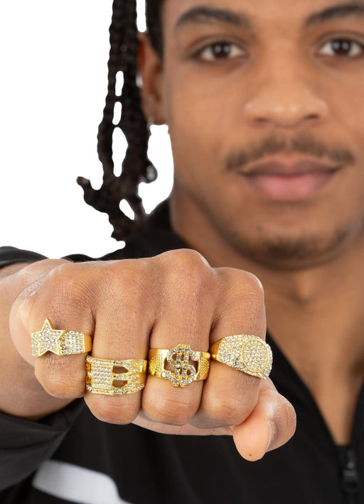 Pack of 4 different 1990's rapper style gold and diamond fancy dress rings.