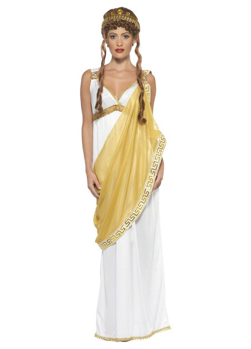 This historical ancient Greek costume of Helen of Troy comes with a long white dress with gold trim and attached gold shawl along with a detailed t...