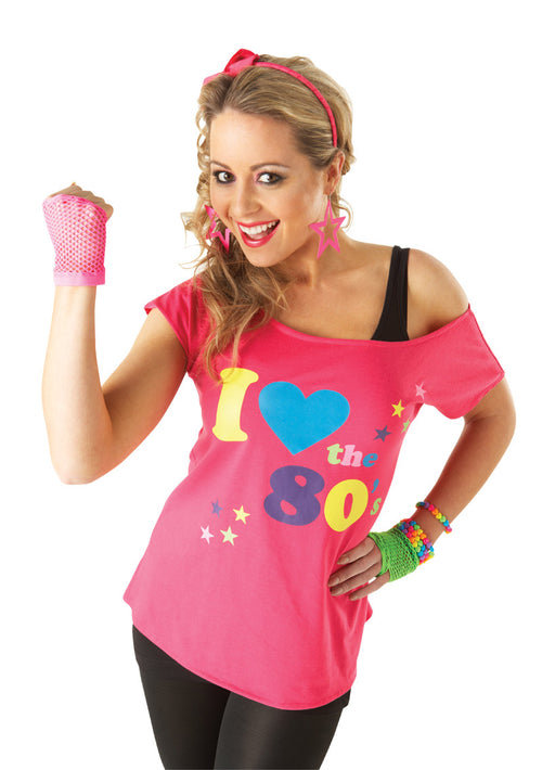 Pink t-shirt with "I Heart the 80's" print in classic retro neon colours. Size Dress Small 8-10 Medium 12-14 Large 16-18 Note: Measure...