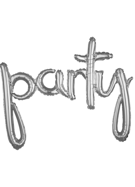 Air filled phrase balloon kit with the word "party" in silver measuring 39 in x 31 in (99 cm x 78 cm) along with straw and ribbon.