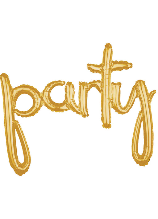 Air filled phrase balloon kit with the word "party" in gold measuring 39 in x 31 in (99 cm x 78 cm) along with straw and ribbon.