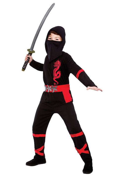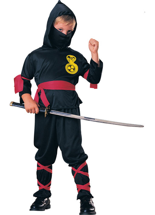 4-piece children's black and red ninja dress up costume with shirt with hood, mask, trousers and belt. Add a ninja sword or some nunchakus to comp...