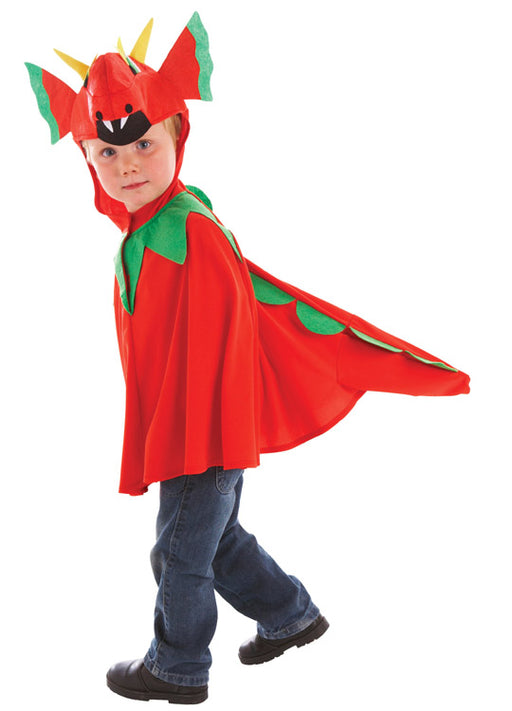 Child's dragon fancy dress costume includes red and green hooded robe with dragon head. Costume Size: One size (would fit up to age 8)
