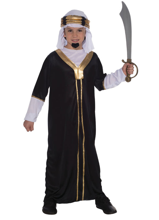 This arab Sultan costume comes with a black and white full length robe finished with gold trimming along with matching headpiece. Size Age Sma...