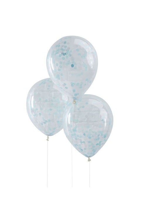 Pack of 5 clear natural rubber latex balloons filled with blue confetti. Supplied online deflated.