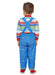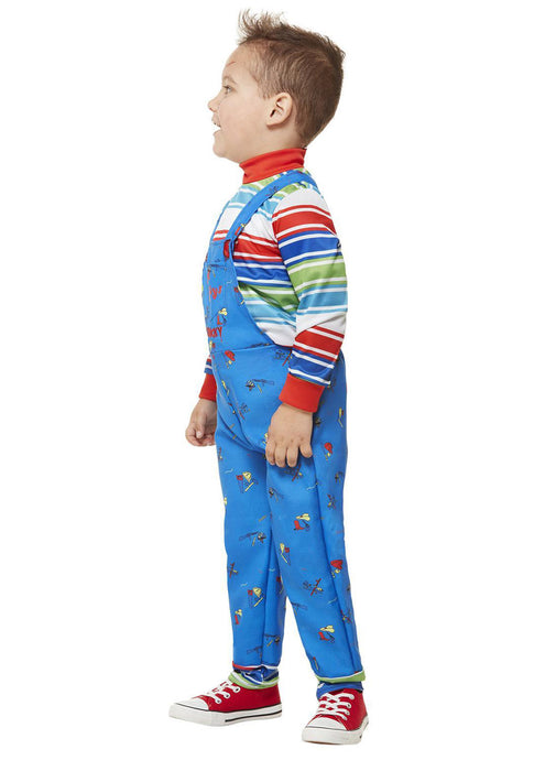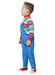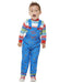 Child's officially licensed Halloween Chucky costume with striped top and printed blue dungarees.