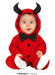 Super cute devil baby Halloween costume with red jumpsuit with black bow tie and hood with demon horns.