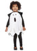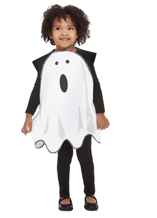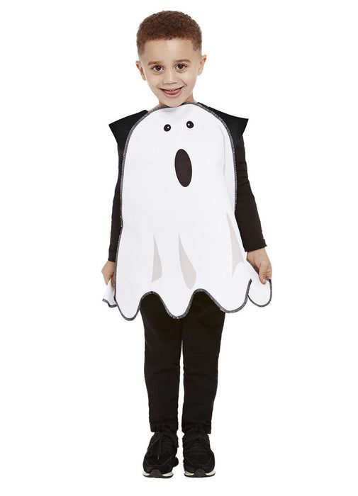 Two sized simple and easy Halloween over the shoulders tabard style Ghost costume. Models are wearing own long sleeved black t-shirt and trousers.