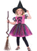 Available in 5 sizes this cute rainbow witch fancy dress Halloween costume comes with a layered pink and black lace effect dress decorated with multi-coloured stars and black pointed witch hat.