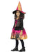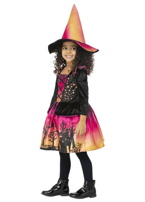 Halloween child's witch costume with ombre colour design including dress and pointed hat.