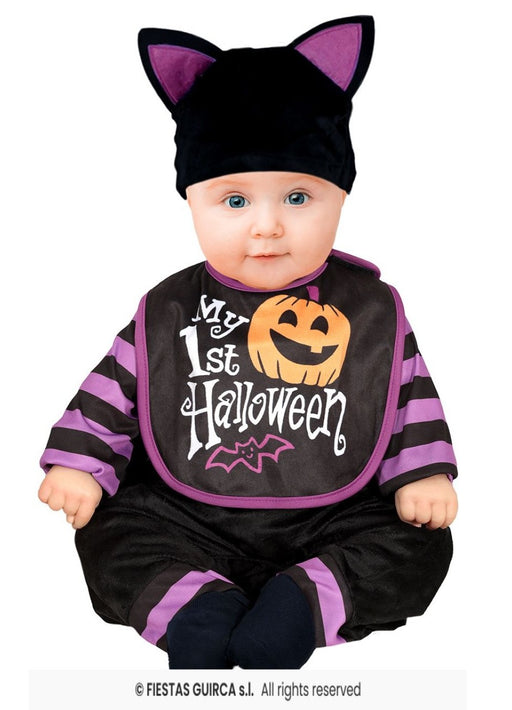 Make their first Halloween extra special with this adorable black and purple baby costume featuring a “My 1st Halloween” bib and playful cat ear ha...