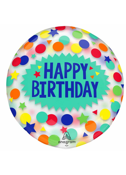 Large round Happy Birthday confetti design Orbz balloon measuring approx. 38 cm (15 in) when inflated. Click & Collect orders: Balloon suppli...