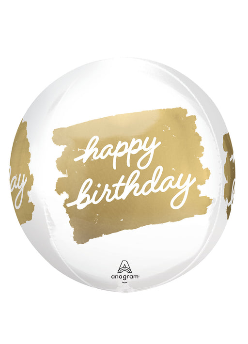 Gold and white Happy Birthday orbz balloon. Balloon is as round as a beach ball when inflated measuring approximately 38cm (15 inches). Click &a...