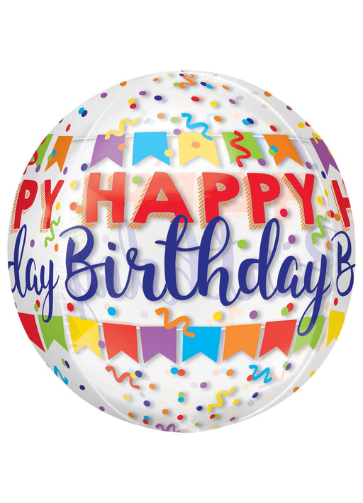 Large round Happy Birthday banner and streamer design Orbz balloon measuring approx. 38 cm (15 in) when inflated. Click & Collect orders: Bal...