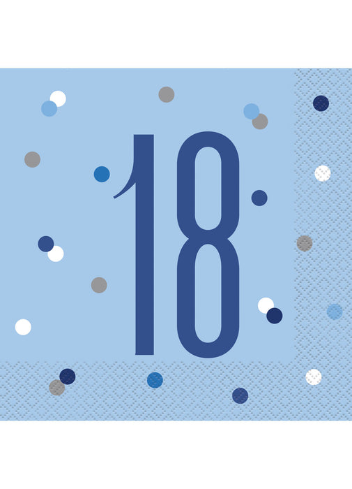 Click to expand Tap to zoom Blue Glitz Age 18 Napkins 16pk Save £-1.99 £1.99 SKU U83555 1 2 3 4 5 6 7 8 9 10+ Quantity Quantity ADD TO BASKET Pack of 16 luncheon 18th Birthday Blue Glitz napkins. 2 ply. 33 x 33cm.