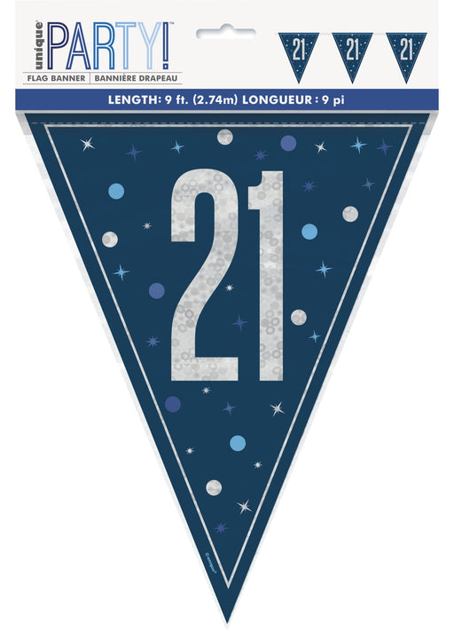 2.74 m/9 ft long Blue Glitz age 21 birthday plastic bunting.