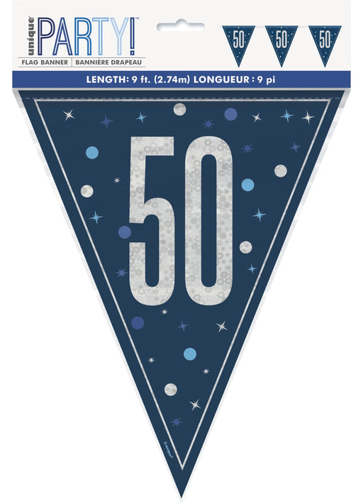 2.74 m/9 ft long Blue Glitz age 50 birthday plastic bunting.