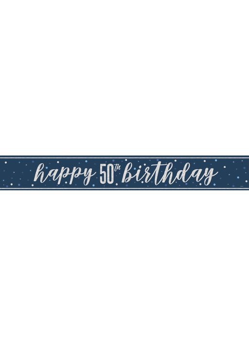 9ft / 2.74m long age 50 Birthday Blue Glitz banner printed one side.