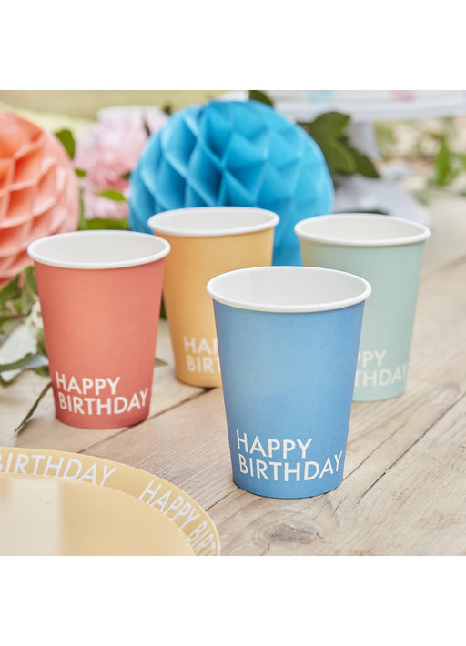 Pack of 8 mixed coloured paper cups with Happy Birthday message.