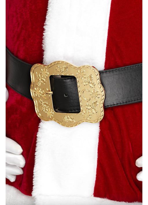 Leather effect black Santa belt with detailed gold buckle engraved with the initials S C. Would fit up to waist 46 inches.