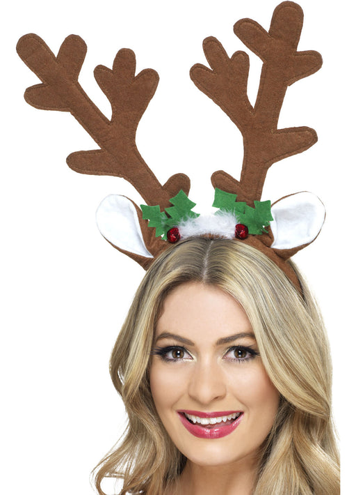 Reindeer Christmas headband with antlers and ears finished with brown marabou trim.
