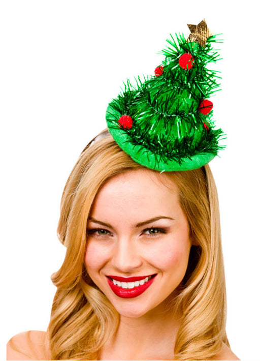Tall Christmas tree hat decorated with green and gold tinsel & golden Christmas star. Please note: Actual product is slightly different to pict...