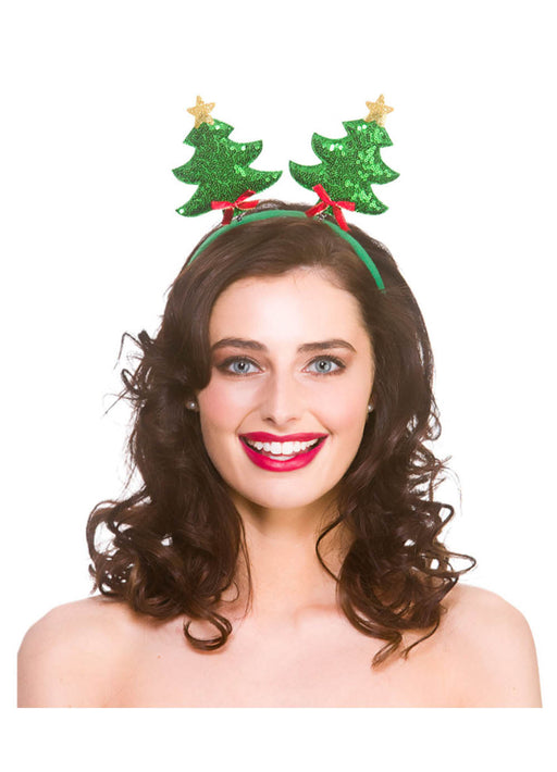 Christmas tree boppers on a green headband finished with green marabou trim.