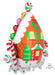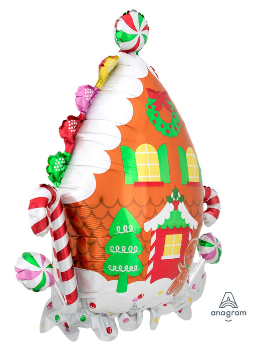 Christmas themed Gingerbread House shaped foil balloon measuring 71 cm x 76 cm (28 x 30 inches) when inflated.