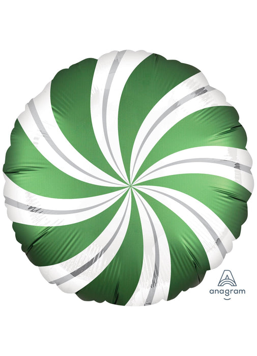 Satin infused green, white and silver candy swirls design round Christmas themed foil balloon measuring 18 inch when inflated.