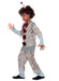 Grey and red Halloween vintage clown boy costume with distressed top, trousers and headband cone hat.